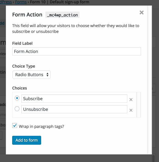 In most cases, you will want a subscribe-only form visible prominently on your blog, while having an unsubscribe form on a dedicated page. To accomplish this, create a new form and include the following hidden field.